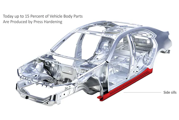 Press hardening (also form hardening) is a process for the hot forming of sheet metal. In this process, the workpieces are heated and then formed by a water-cooled tool and cooled at the same time. This is how robust components are created.
