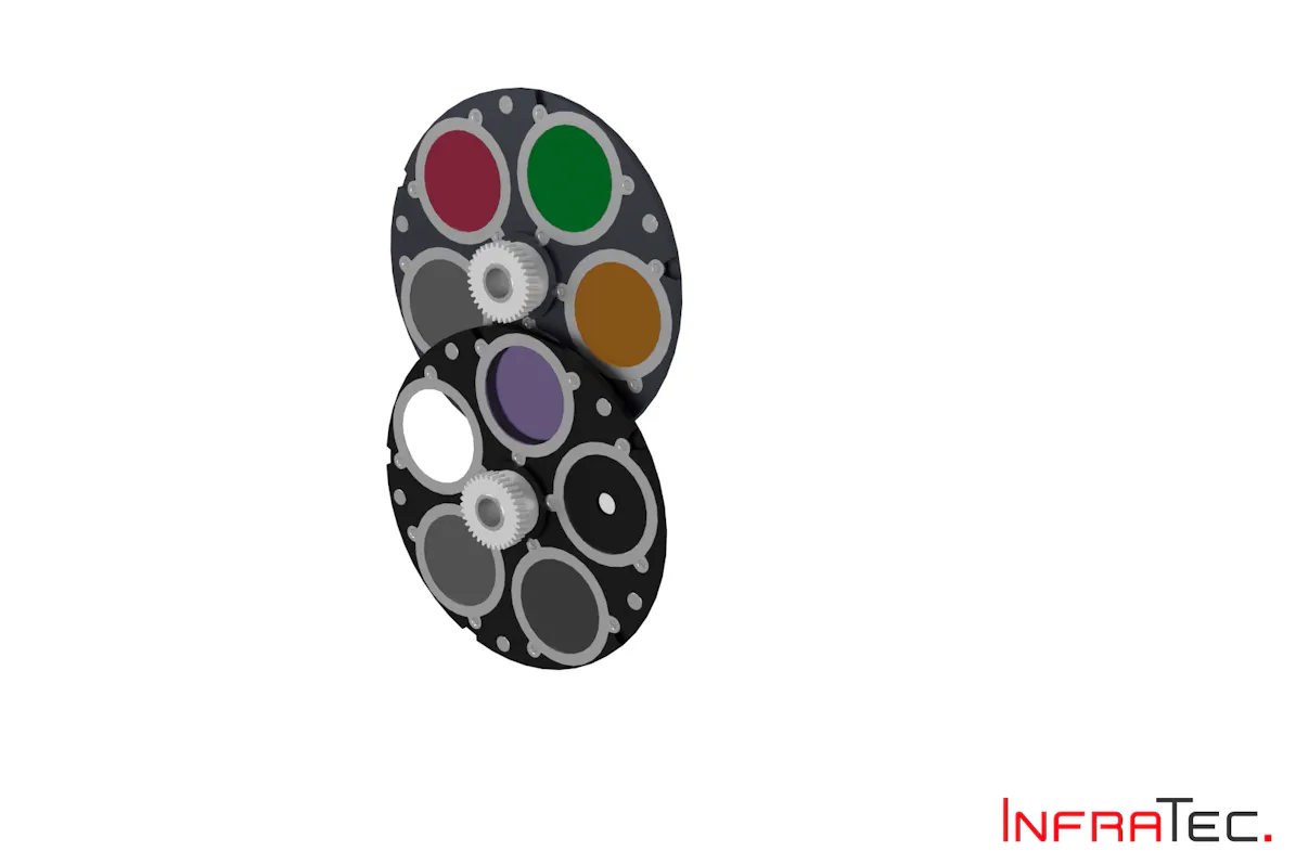 Material specific emissivity and transmissivity properties have to be taken into account while measuring with infrared camera systems. The integration of spectral filters makes use of those specifics for special measurements. For example, spectral ranges of thin PE foils can be excluded in case they are highly transmissive – to say transparent. Like this only the radiation will be measured which is purely emitted by the foil itself. Based on its long experience in thermography InfraTec can support you in selecting the right spectral filter. The infrared camera systems of the ImageIR® series can integrate a remotely controllable filter wheel which can hold up to four spectral filters. The filter position close to the detector can avoid warm aperture effects and allows for the usage of smaller and thereby cheaper filters in the infrared camera.
